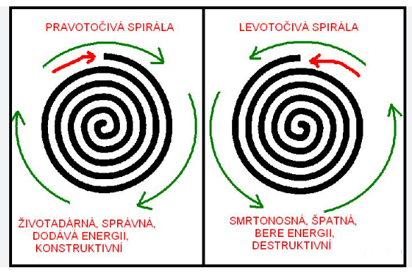 - Podstatnou roli ve funkci spirály je směr, kam se odvíjí. Pokud se spirála stáčí od středu doleva (pokud se směrem od středu odvíjí proti směru hodinových ručiček), pak energii ubírá, pravotočivá zase přidává.