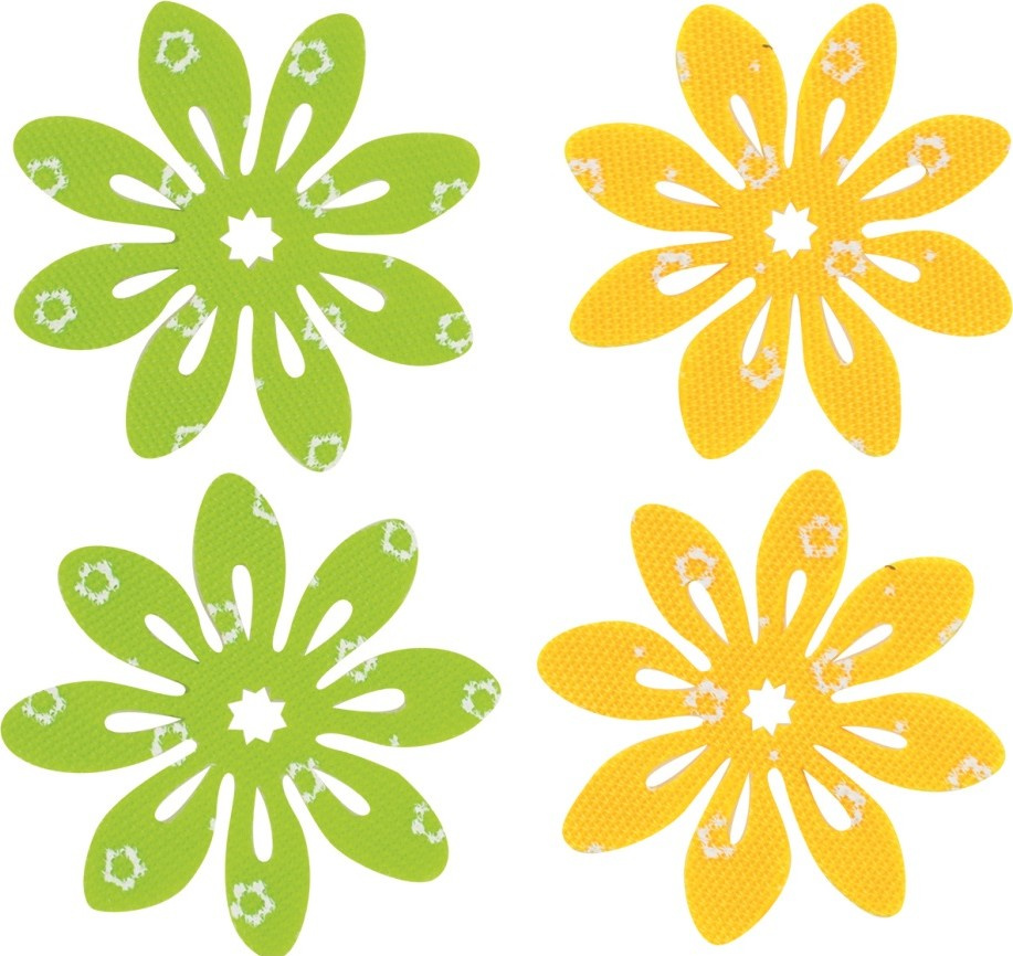 Kytičky s lepíkem na zadní straně v zelené a žluté barvě o velikosti 5 cm například oživí dárečky nebo přáníčka vašim blízkým. Kytičkami můžete také dozdobit vaše dekorace a jarní tabuli.