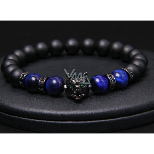 Láva černá + Tygří oko tmavě modré + Vlčí hlava náramek elastický přírodní kámen, kulička 8 mm / 21 cm