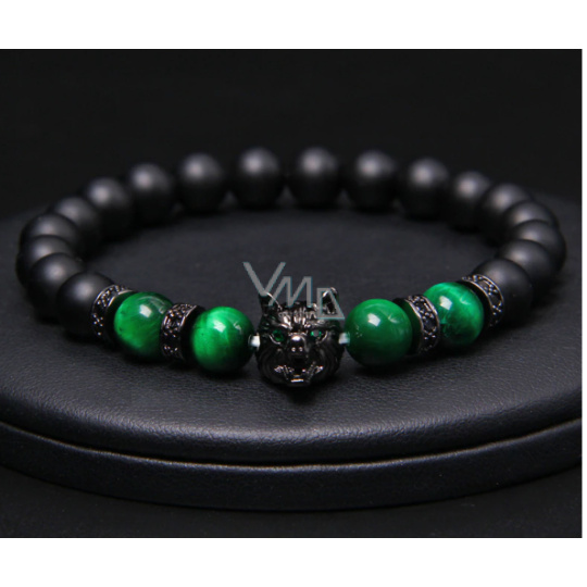 Onyx černý matný + Tygří oko zelené + Vlčí hlava náramek elastický přírodní kámen, kulička 8 mm / 21 cm