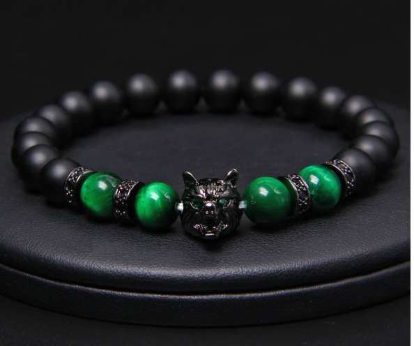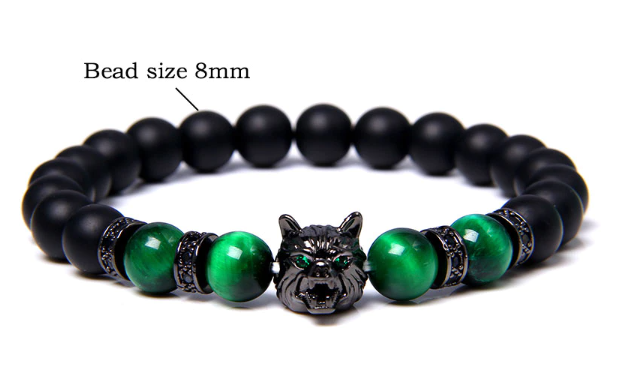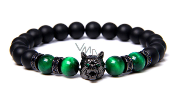 Onyx černý matný + Tygří oko zelené + Vlčí hlava náramek elastický přírodní kámen, kulička 8 mm / 21 cm