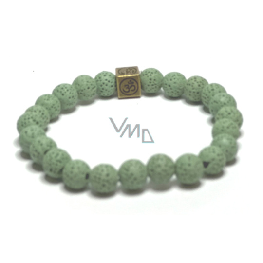 Láva světle zelená s královskou mantrou Óm, náramek elastický přírodní kámen, kulička 8 mm / 16 - 17 cm, zrozen ze čtyř živlů