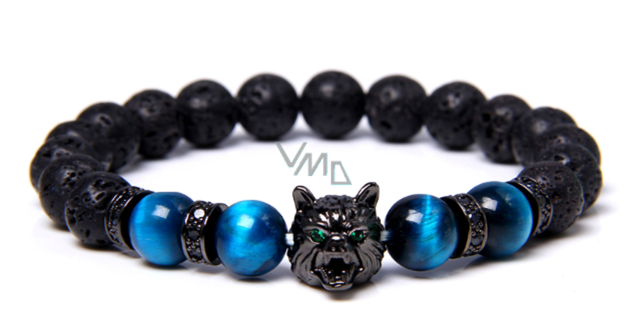 Láva + Tygří oko světle modré + Vlčí hlava náramek elastický přírodní kámen, kulička 8 mm / 21 cm