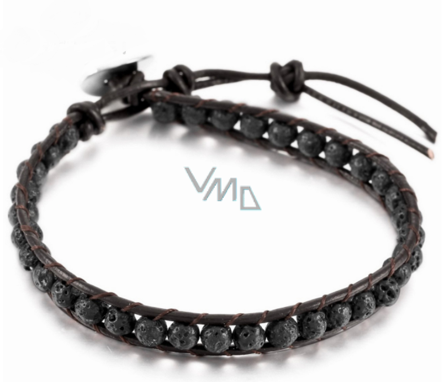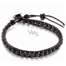 Láva černá, kožený náramek přírodní kámen, ručně vyráběný, zapínací, kulička 4 mm / 17 - 23 cm, zrozen ze čtyř živlů