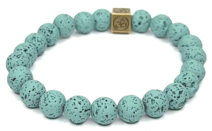 Láva pastelově zelená s královskou mantrou Óm, náramek elastický přírodní kámen, kulička 8 mm / 16 - 17 cm, zrozen ze čtyř živlů