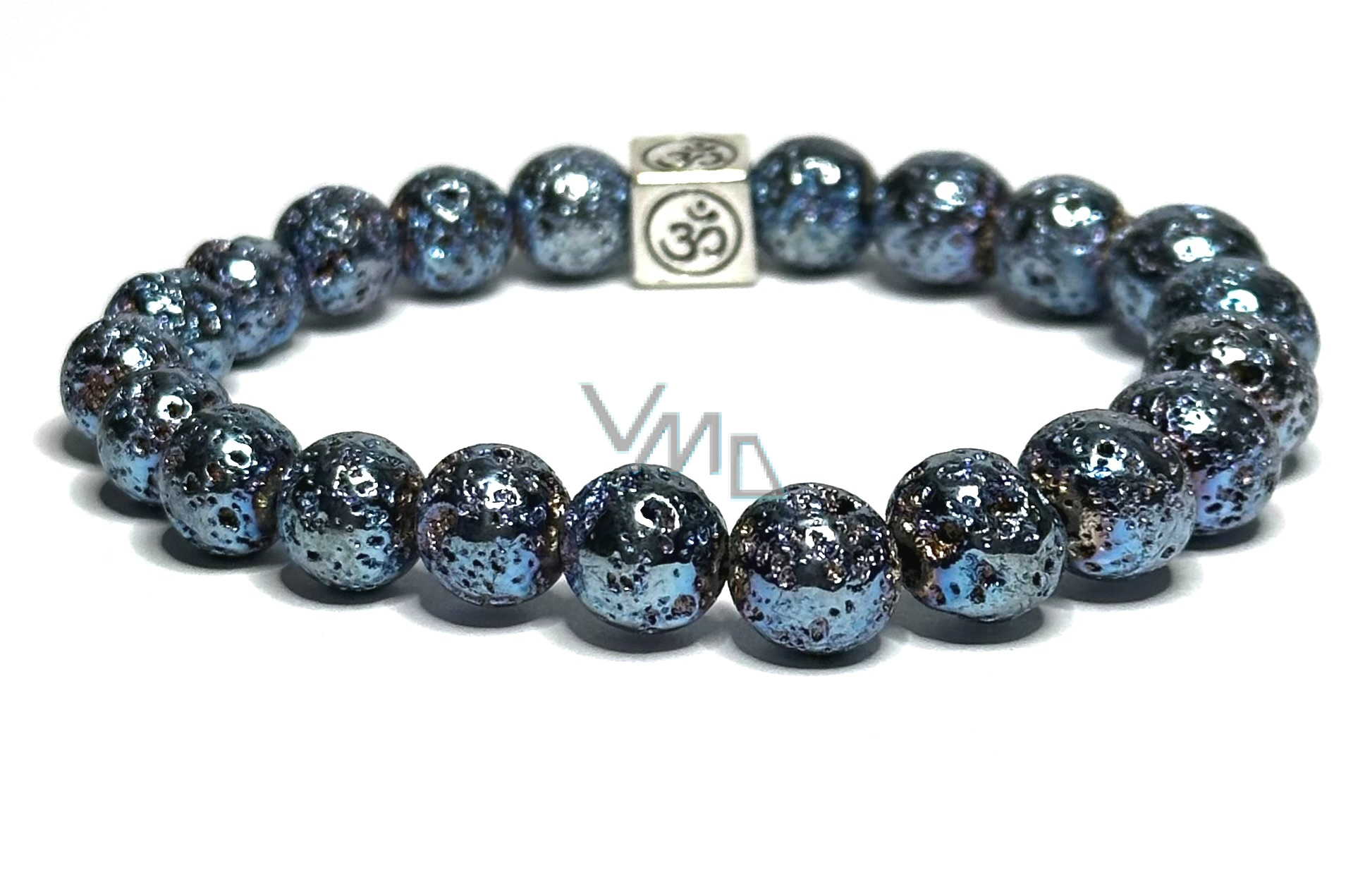 Láva modrá pokovovaná s královskou mantrou Óm, náramek elastický přírodní kámen, kulička 8 mm / 16 - 17 cm, zrozen ze čtyř živlů