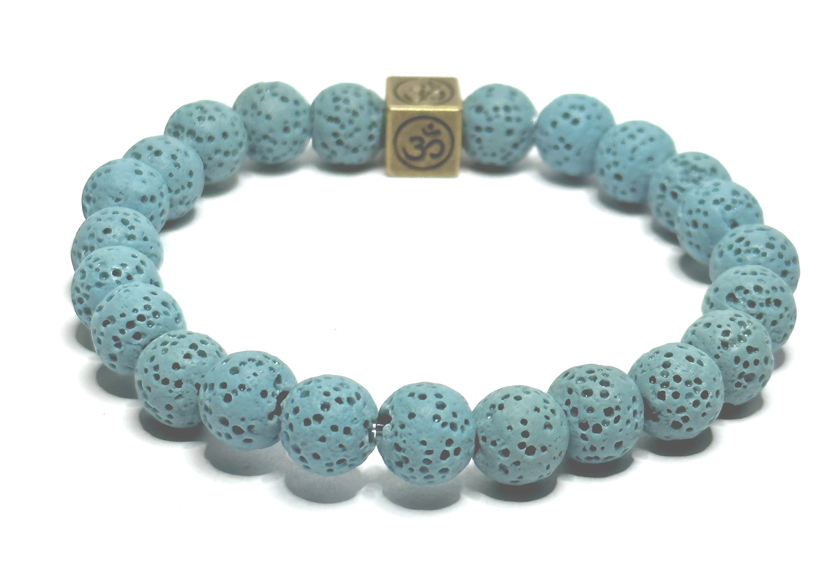 Láva světle modrá s královskou mantrou Óm, náramek elastický přírodní kámen, kulička 8 mm / 16 - 17 cm, zrozen ze čtyř živlů