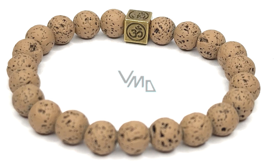 Láva světle hnědá s královskou mantrou Óm, náramek elastický přírodní kámen, kulička 8 mm / 16 - 17 cm, zrozen ze čtyř živlů