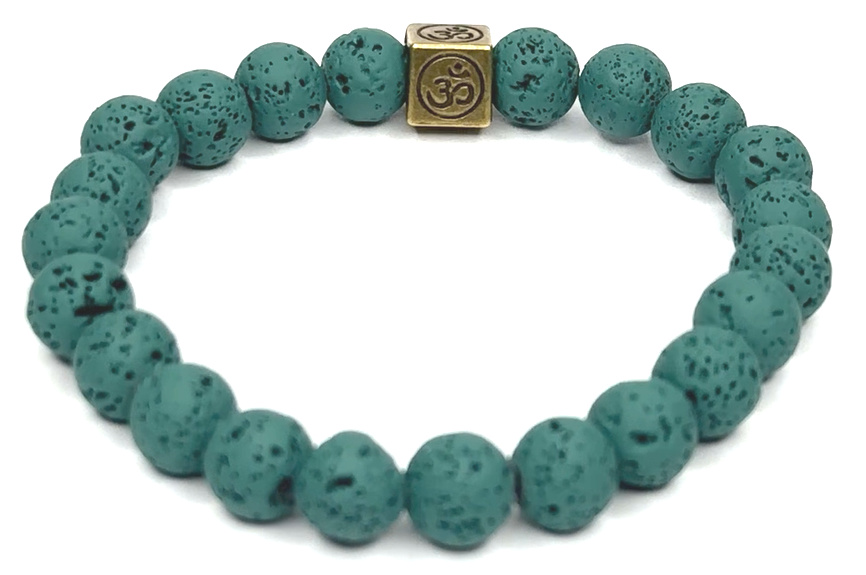 Láva tmavě zelená s královskou mantrou Óm, náramek elastický přírodní kámen, kulička 8 mm / 16 - 17 cm, zrozen ze čtyř živlů