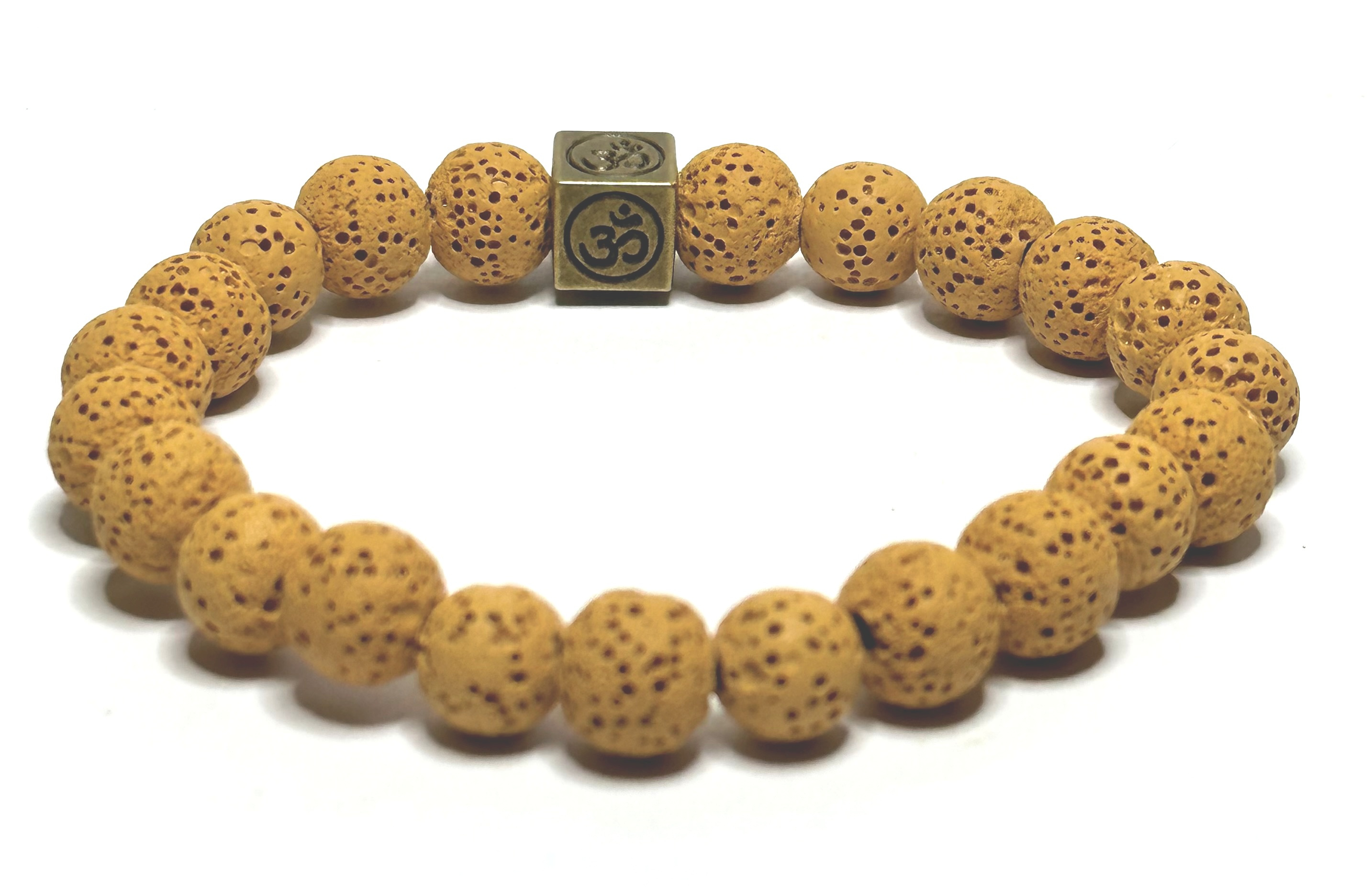 Láva žlutá s královskou mantrou Óm, náramek elastický přírodní kámen, kulička 8 mm / 16 - 17 cm, zrozen ze čtyř živlů