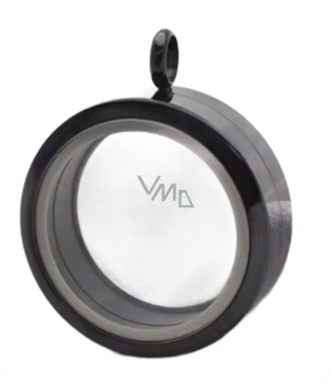 Stylový „memory“ medailon z nerezové oceli černý, Ø 30 mm (tl. 11 mm) s průhlednými okénky a bezpečným otočným (závitovým) uzávěrem. Elegantní černá povrchová úprava podtrhne kamínky, korálky či drobné šarmy, které si do medailonu vložíte.