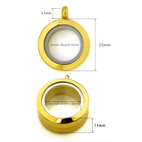 Jemný „memory“ medailon z nerezové oceli s průhlednými okénky a bezpečným otočným (závitovým) uzávěrem. Elegantní zlatá úprava a kompaktní průměr 25 mm – ideální na každodenní nošení i vrstvení s dalšími šperky.