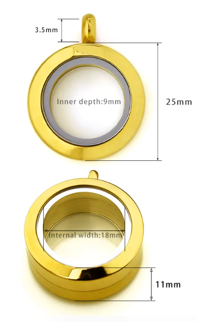 Jemný „memory“ medailon z nerezové oceli s průhlednými okénky a bezpečným otočným (závitovým) uzávěrem – zlatý, Ø 25 mm (tl. 11 mm). Elegantní zlatá úprava a kompaktní průměr 25 mm – ideální na každodenní nošení i vrstvení s dalšími šperky.