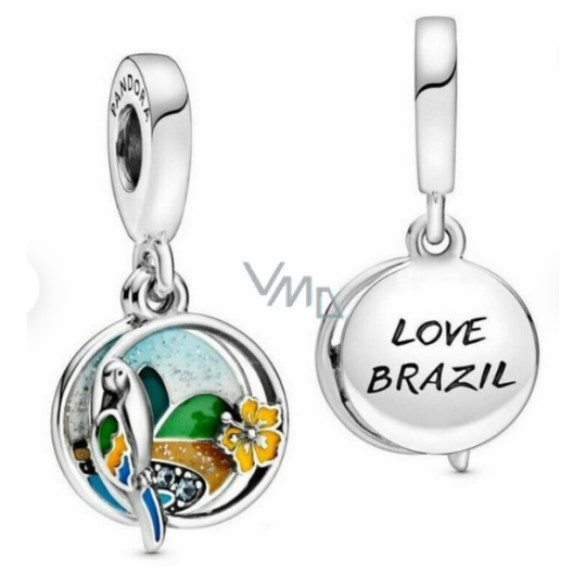 Přiveďte zpět vzpomínky na Brazílii s tímto barevným visícím kouzlem! Přední disk se skládá ze dvou prvků a představuje papouška s jasným peřím a žlutým smaltovaným květem ibišku. Za třpytivou plážovou scénou je vyobrazena modrá a zelená smalty a bleděmodré kameny. Na zadní straně přívěsku je vyrytý nápis „Love Brazil“.