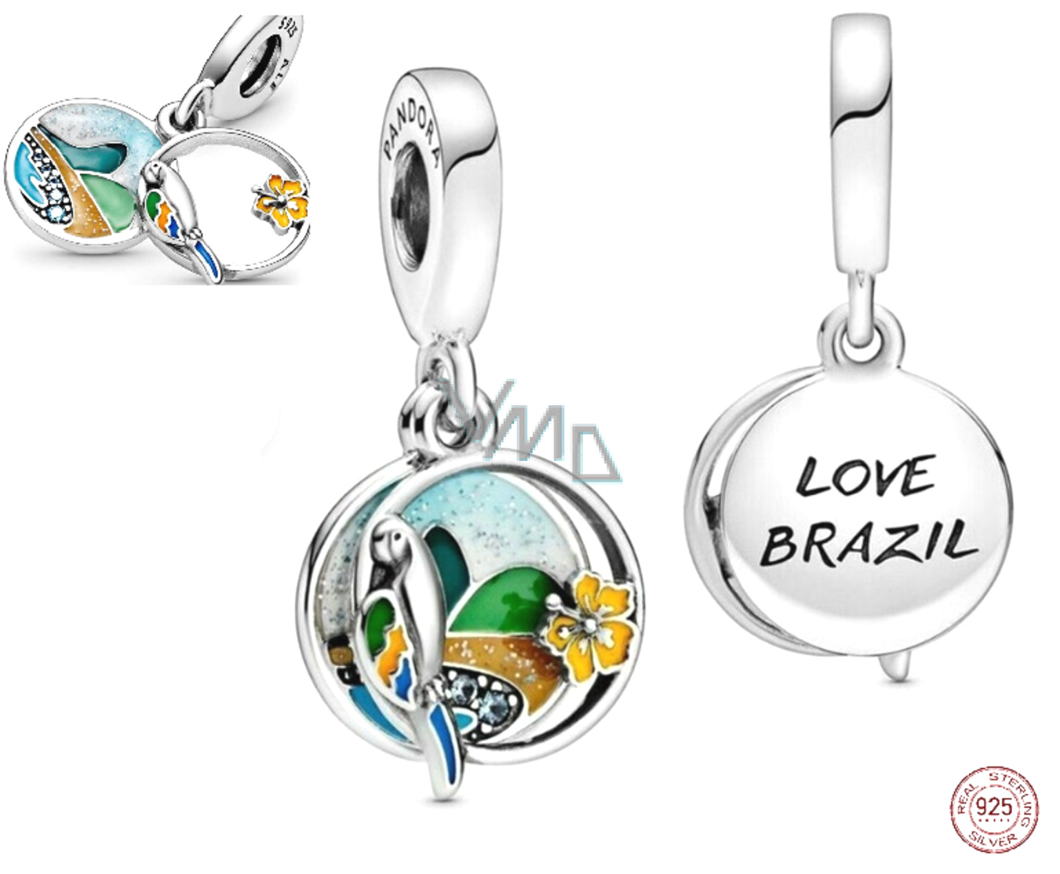 Přiveďte zpět vzpomínky na Brazílii s tímto barevným visícím kouzlem! Přední disk se skládá ze dvou prvků a představuje papouška s jasným peřím a žlutým smaltovaným květem ibišku. Za třpytivou plážovou scénou je vyobrazena modrá a zelená smalty a bleděmodré kameny. Na zadní straně přívěsku je vyrytý nápis „Love Brazil“.