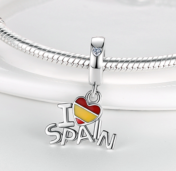 Přemýšlíte, co si přivezete z výletu ze Španělska? Kupte si tento stříbrný přívěsek na náramek s motivem I Love Spain a vzpomeňte si na tento výlet, kdykoliv se podíváte na svůj náramek.