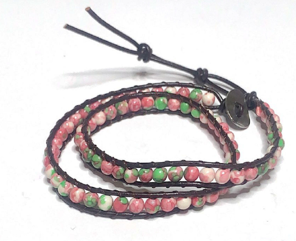 Mramor Rose Red kožený hnědý náramek přírodní kámen zavinovací ručně pletený kulička 6 mm / cca 34 cm + 5 cm