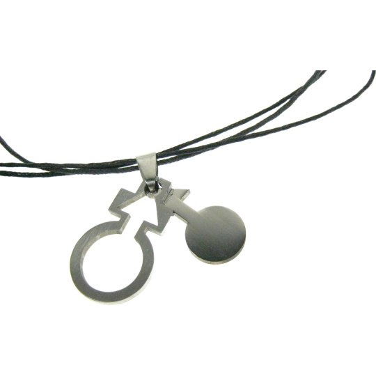 Kožený náhrdelník s ocelovým přívěškem. Přívěšek je z části matný a z části lesklý. Zapínání na klasickou karabinku.