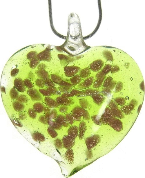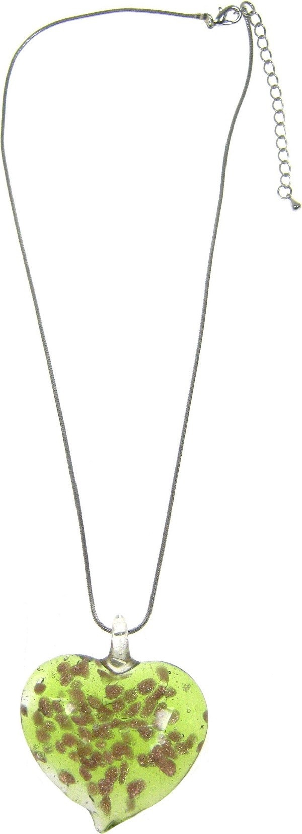 Náhrdelník se skleněným přívěškem ve tvaru srdce. Průhledné srdce má zelenou barvu s broskvově růžovými třpytkami uvnitř. Bižuterní kov má stříbrnou barvu. Zapínání na klasickou karabinku.
