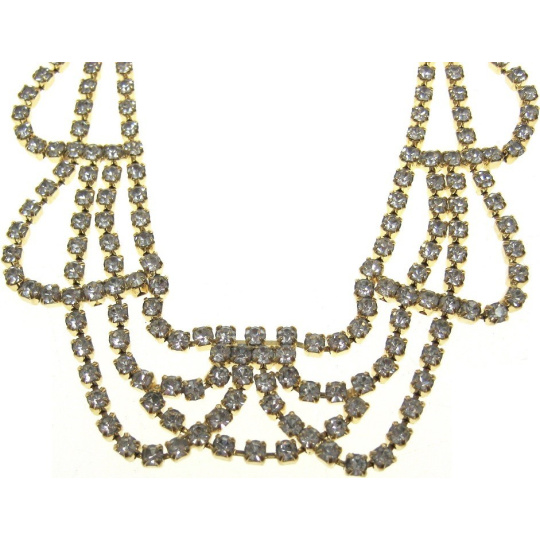 Náhrdelník vyrobený z broušených stříbrných štrasových kamínků. Bižuterní kov má zlatou barvu. Náhrdelník je vhodný pro nevěstu na svatbu, na ples nebo pro družičky, ale je vhodný i na běžné nošení.