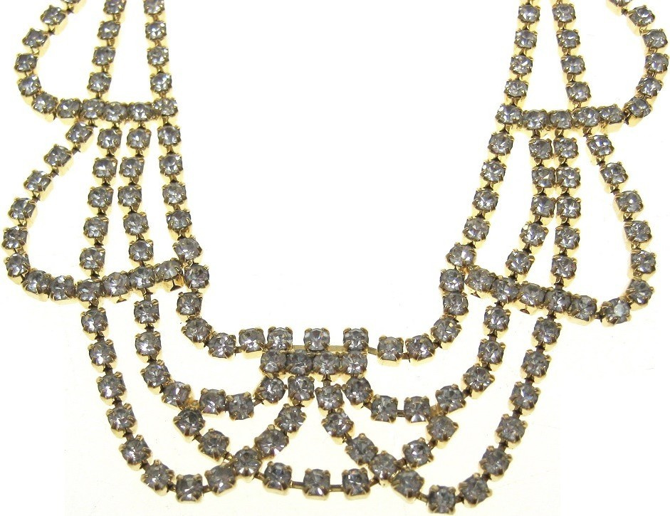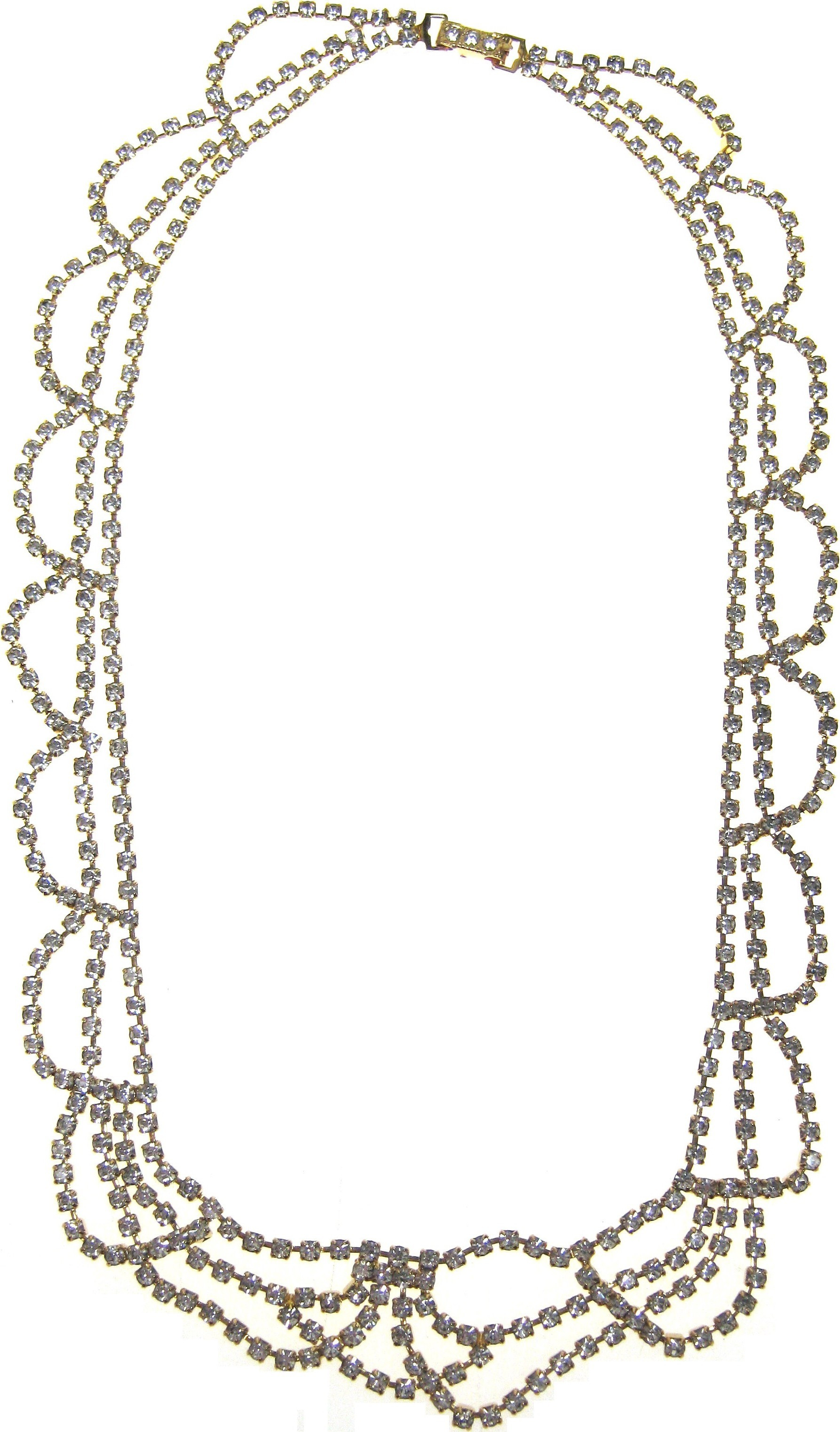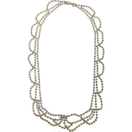 Náhrdelník vyrobený z broušených stříbrných štrasových kamínků. Bižuterní kov má zlatou barvu. Náhrdelník je vhodný pro nevěstu na svatbu, na ples nebo pro družičky, ale je vhodný i na běžné nošení.