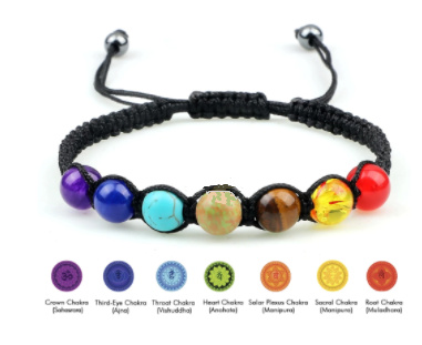 Sedm barevných korálků z polodrahokamů představuje sedm hlavních čaker. Čakry jsou energetická centr