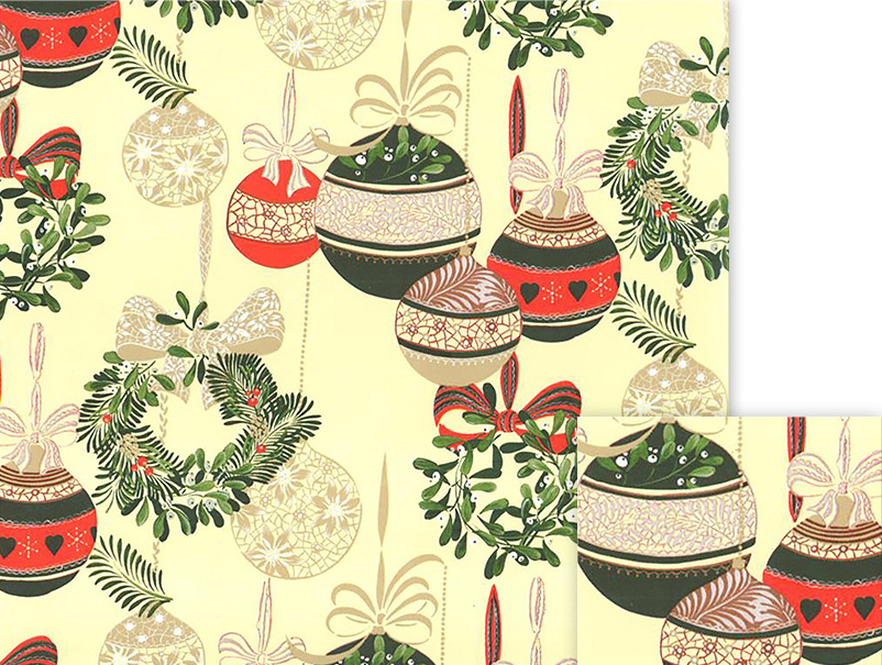 Nekupto Dárkový balicí papír 70 x 500 cm Vánoční Světle žlutý zelené, zlaté, červené baňky