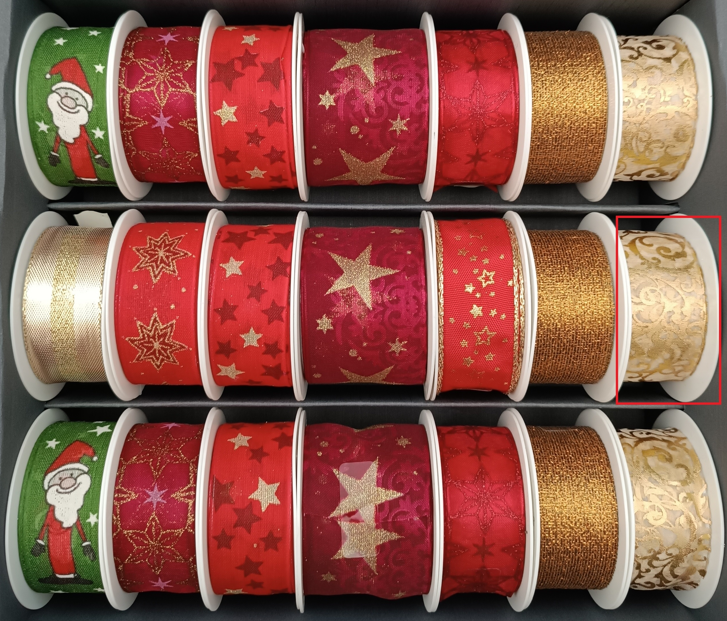 Krásná látková stuha se vzorem zlatých ornamentů je vhodná k vánočnímu aranžmá. Lze je použít při vazbě řezaných i sušených květin, ozdobit dárkové předměty nebo balíčky. Zabalte dárky jednoduše do balícího papíru a omotejte těmito krásnými veselými stuhami.