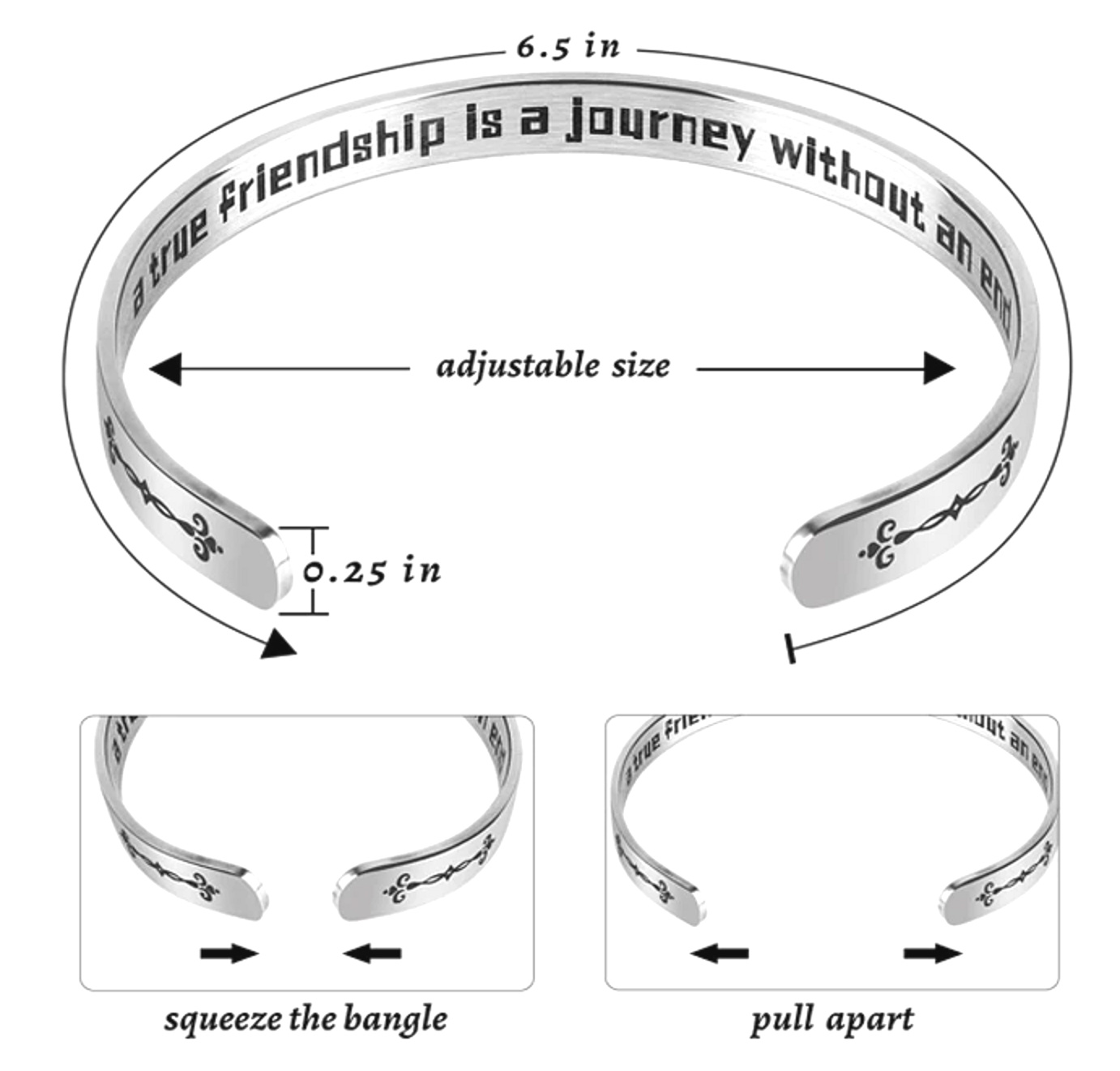Motivační náramek je vyroben z Hypoalergenní nerezové oceli, je odolný, pevný, ale zároveň lehký. Je dostatečně flexibilní a s jemným stiskem nebo mírným roztažením jej lze nastavit pro většinu velikostí zápěstí. Věnujte originální dárek a vyjádřete tak lásku či vděčnost obdarovanému!