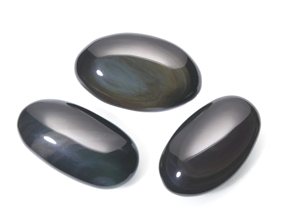 Unikátnost kamene: Pro obsidián duhový je charakterická tmavá až černá barva s jemně proužkovanou kresbou. Při správném vybroušení kamene a pod silným jasným světlem se na jeho vrstvičkách mohou díky lomu světla tvořit duhové efekty.