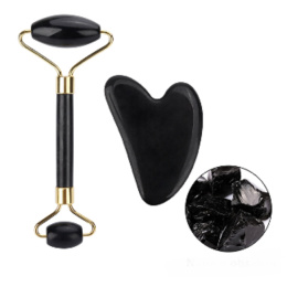 Obsidian Gua Sha 5 x 8 cm + váleček masážní 14 x 5,5 cm redukuje vrásky, otoky, zlepšuje pružnost pokožky, sada bez obalu