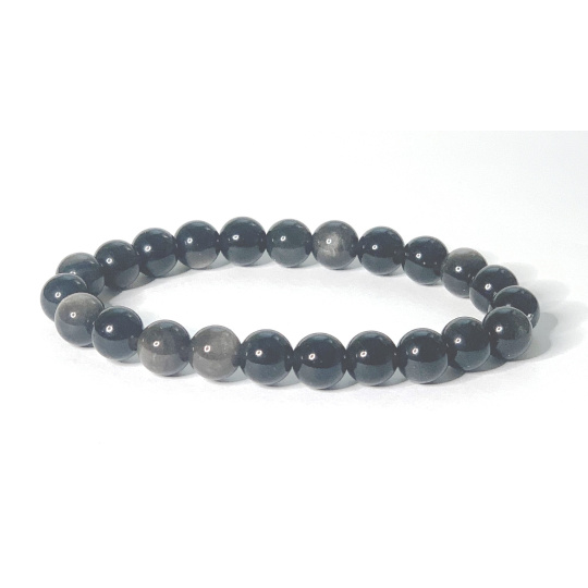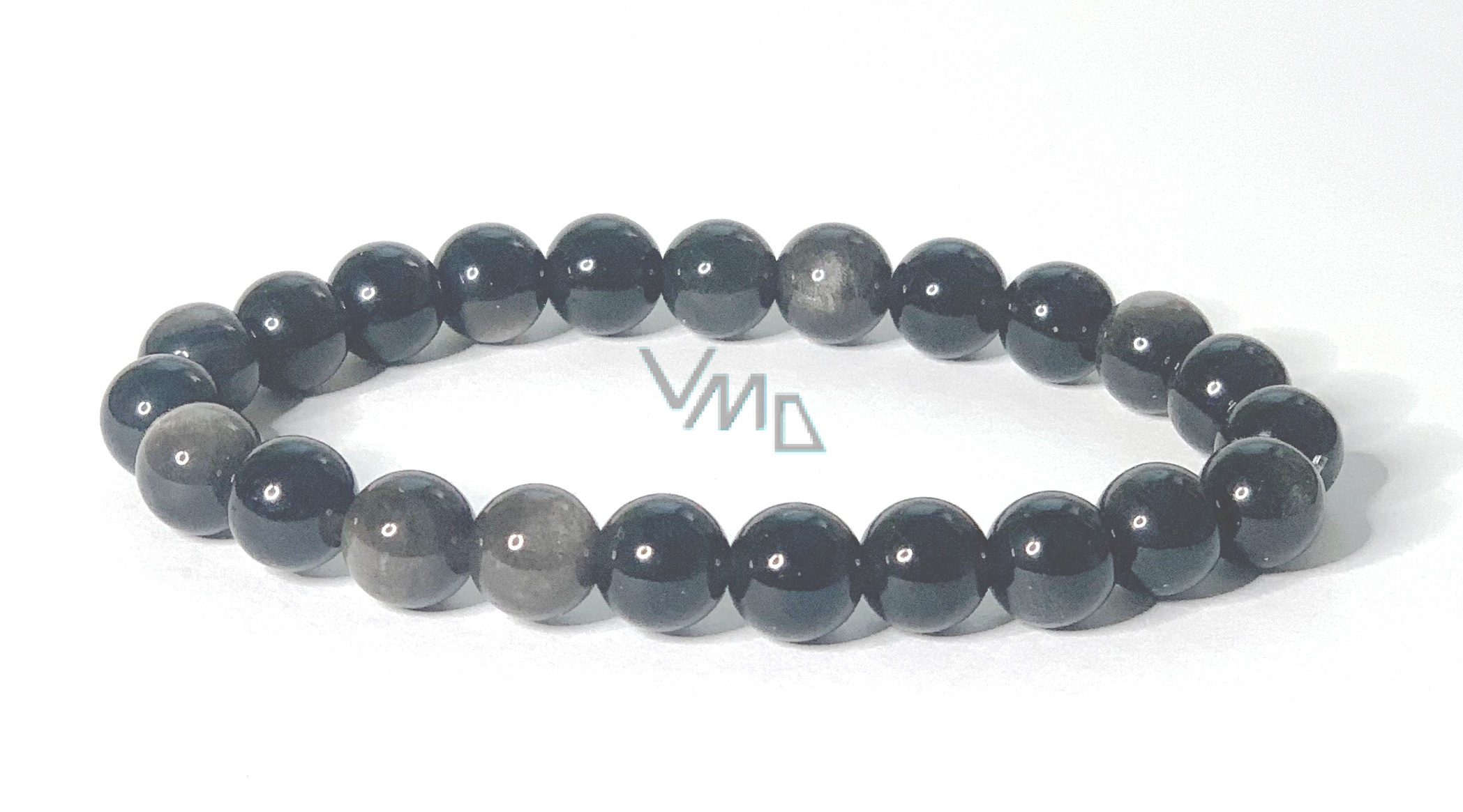 Obsidian stříbřitě lesklý náramek elastický přírodní kámen, kulička 8 mm / 16 - 17 cm, kámen záchrany