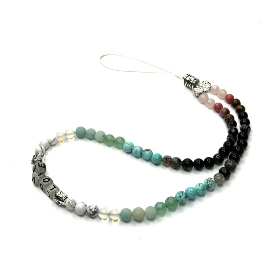 - Přívěsek na telefon disponuje korálky z přírodního kamene na šňůrce, kterou lze upevnit ke krytu telefonu