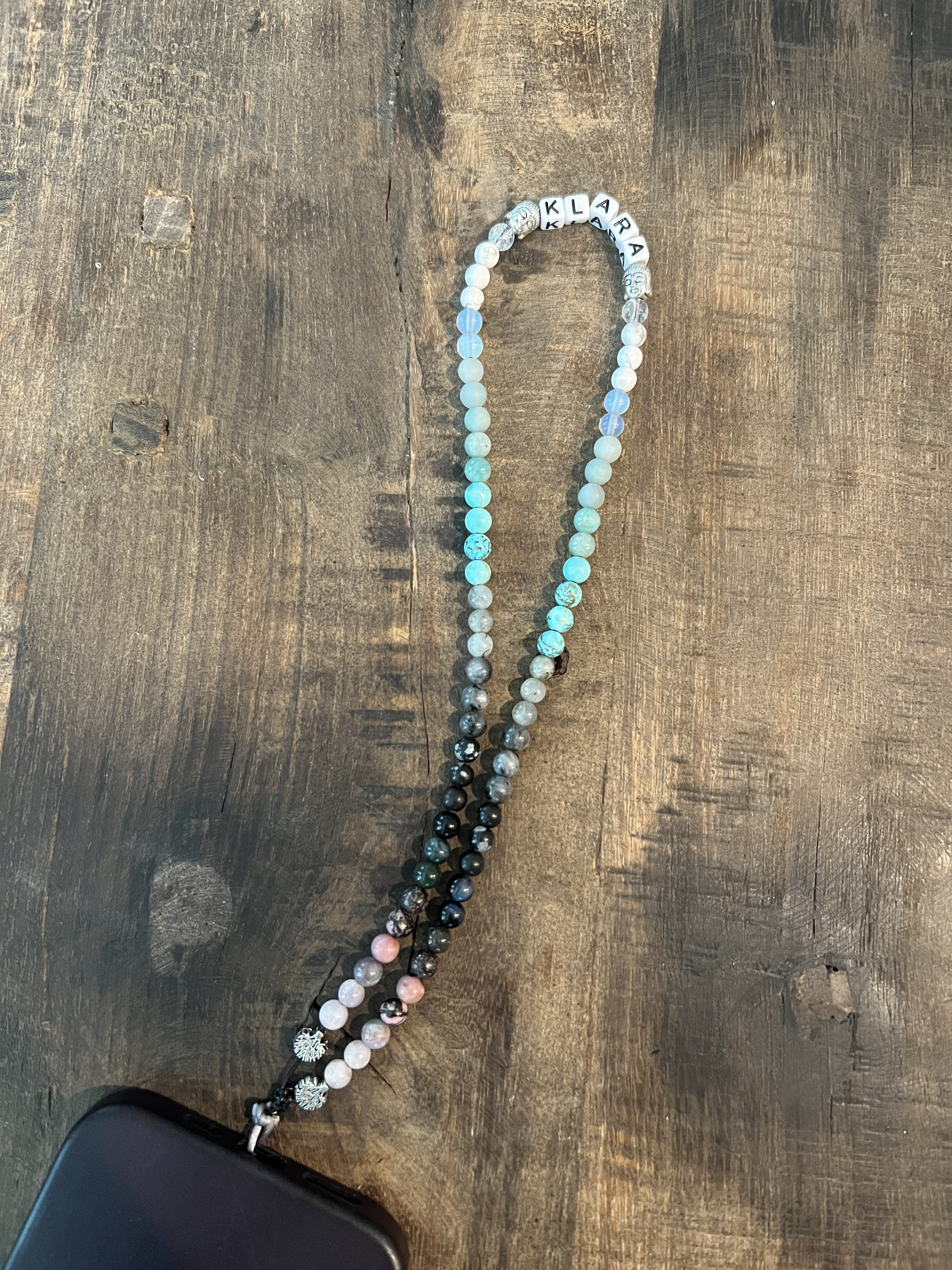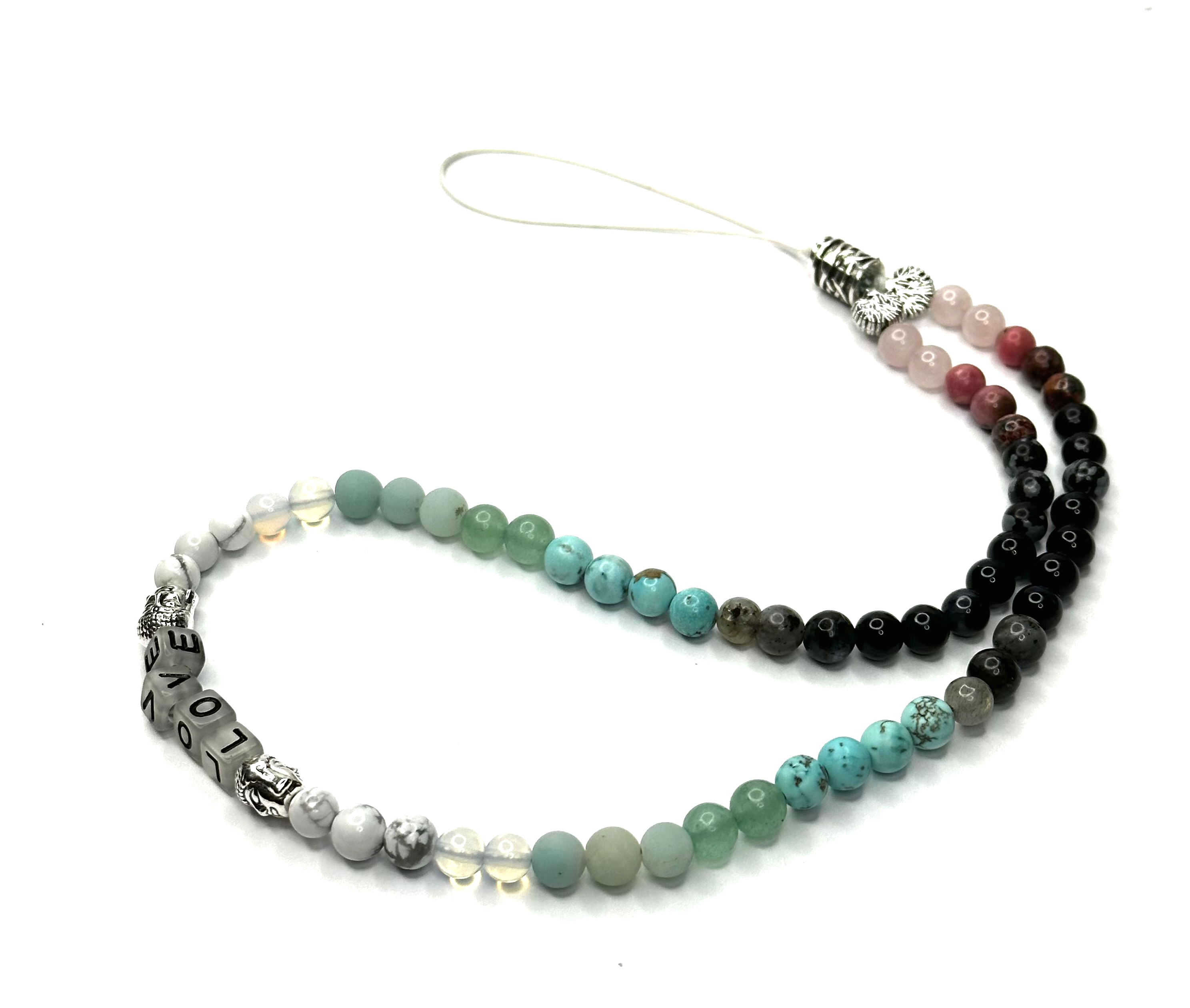 - Přívěsek na telefon disponuje korálky z přírodního kamene na šňůrce, kterou lze upevnit ke krytu telefonu