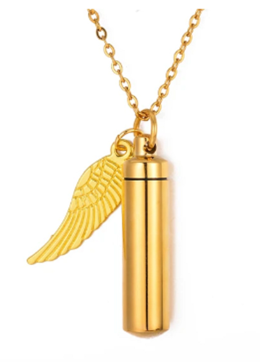 Pamětní, pietní urnový přívěsek, andělská křídla zlatý voděodolný, nerezová ocel 9 x 37 mm + řetízek 56 cm