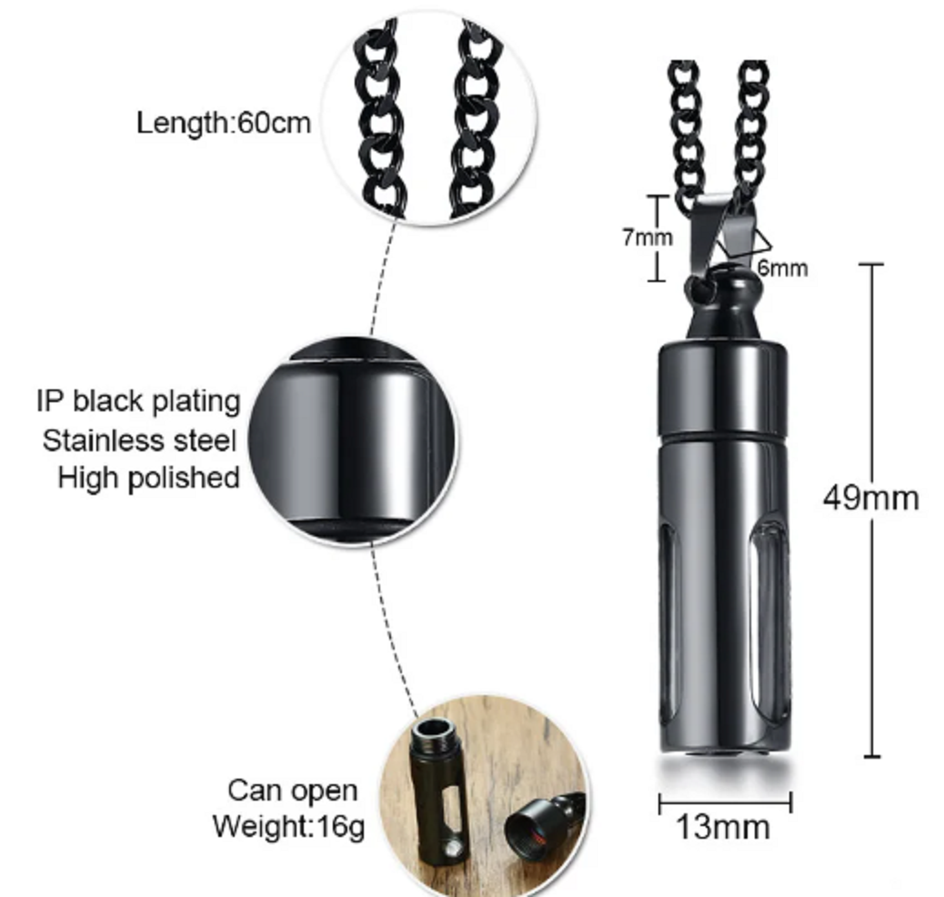 Pamětní, pietní urnový přívěsek, Dutá trubice, voděodolná, nerezová ocel, černá 13 mm x 49 mm + 60 cm řetízek
