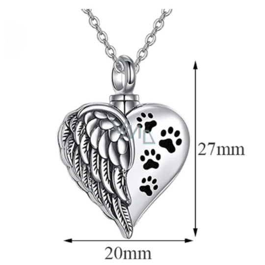 Pamětní, pietní urnový přívěsek, Srdce Andělská křídla + tlapky voděodolné, nerezová ocel 20 x 27 mm + řetízek 60 cm