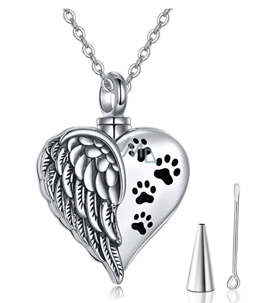 Pamětní, pietní urnový přívěsek, Srdce Andělská křídla + tlapky voděodolné, nerezová ocel 20 x 27 mm + řetízek 60 cm