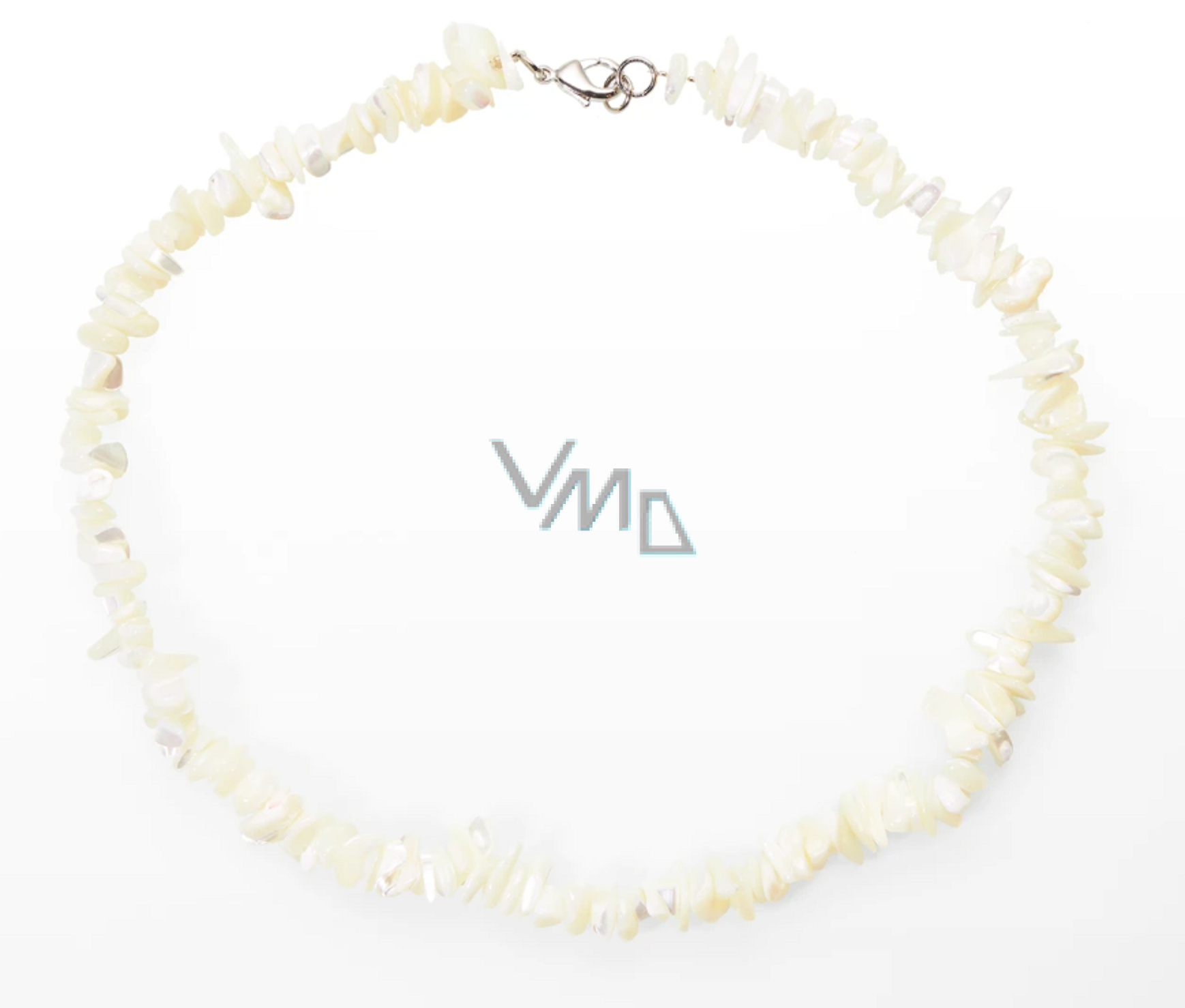 Perleť je speciální materiál, který se tvoří uvnitř schránky mušle. Je tvrdý, kompaktní, má krásnou bílou barvu s Perleťovými odlesky. Perleť se v bižuterii využívá už od pradávna. Pochází z Číny. Sekaný náhrdelník je tvořen z drobných kamínků nepravidelných tvarů a má délku 40-45 cm. Náhrdelník je ukončen zapínáním ze stříbřeného tombaku.
