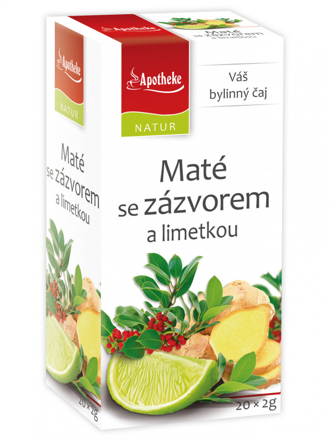 Apotheke Maté se Zázvorem a Limetkou je bylinný čaj aromatizovaný, porcovaný v nálevových sáčcích. Bylinná směs lístků maté s lehce štiplavým kořenem zázvoru, doplněná listy stevie, které čaji dodávají na sladkosti.