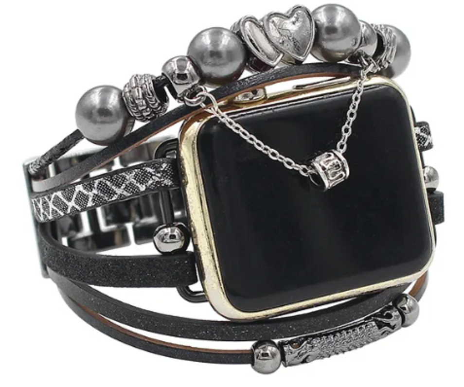 Pasek do Apple Watch ręcznie robiony czarny + korale + serce, rozmiar 38/40/41 mm