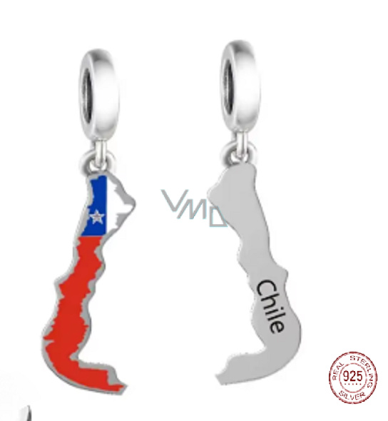 Charm Sterlingové stříbro 925 Chile vlajka - houpající se mapa, přívěsek na náramek cestování