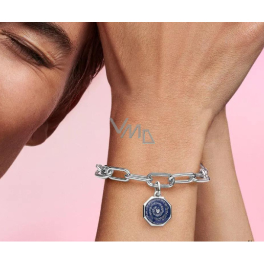 Poczuj kosmiczną miłość z mini zawieszką. Jedna strona tego ośmiokątnego medalionu z zawieszki z monety srebrnej ma wygrawerowane serce otoczone żywym ciemNoniebieskim emaliowanym kamieniem. Z drugiej strony wygrawerowane jest serce otoczone wygrawerowanymi promieniami z mikrokoralikami. Ten medalion, zaprojektowany tak, aby był stylizowany na otwierane pudełko, noś jako przypomnienie, że miłość zawsze trwa i jest sercem naszego tajemniczego wszechświata. Kompatybilny z Pandora ME i Pandora Moments
