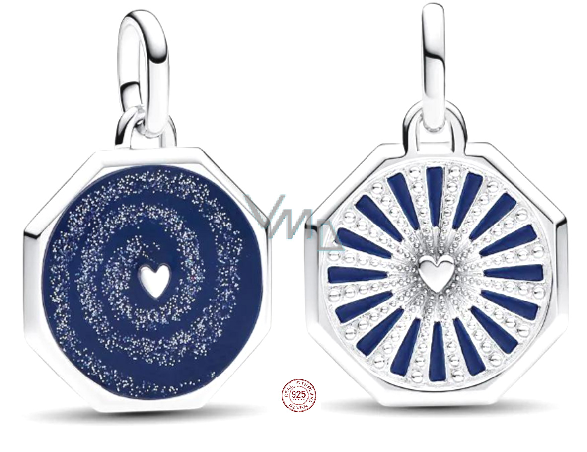 Poczuj kosmiczną miłość z mini zawieszką. Jedna strona tego ośmiokątnego medalionu z zawieszki z monety srebrnej ma wygrawerowane serce otoczone żywym ciemNoniebieskim emaliowanym kamieniem. Z drugiej strony wygrawerowane jest serce otoczone wygrawerowanymi promieniami z mikrokoralikami. Ten medalion, zaprojektowany tak, aby był stylizowany na otwierane pudełko, noś jako przypomnienie, że miłość zawsze trwa i jest sercem naszego tajemniczego wszechświata. Kompatybilny z Pandora ME i Pandora Moments