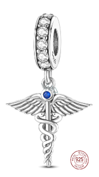 Wisiorek z kaduceuszem, symbolem medycyny, składający się z dwóch splecionych węży na trzonie z anielskimi skrzydłami, ozdobiony niebieskimi i białymi błyszczącymi kamieniami cyrkonowymi.