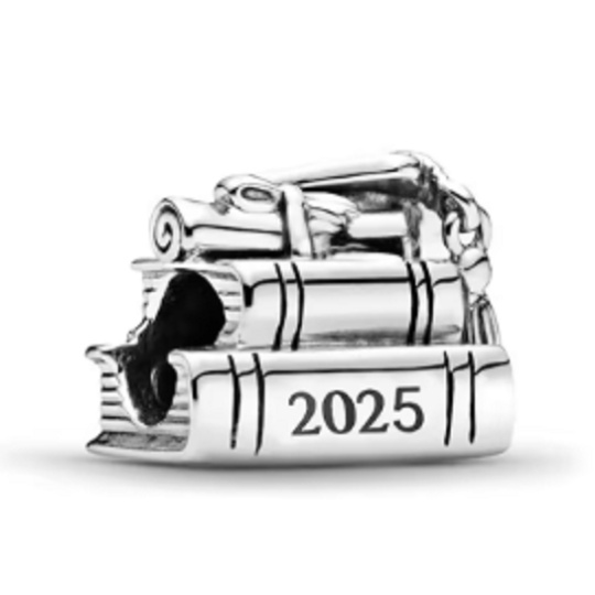 Krásný korálek ze sterlingového stříbra 925 ve tvaru knihy, promoční čepice a svitku který má na sobě vyrytý rok 2025. Věnujte krásnou upomínku čerstvému absolventovi střední či vysoké školy.