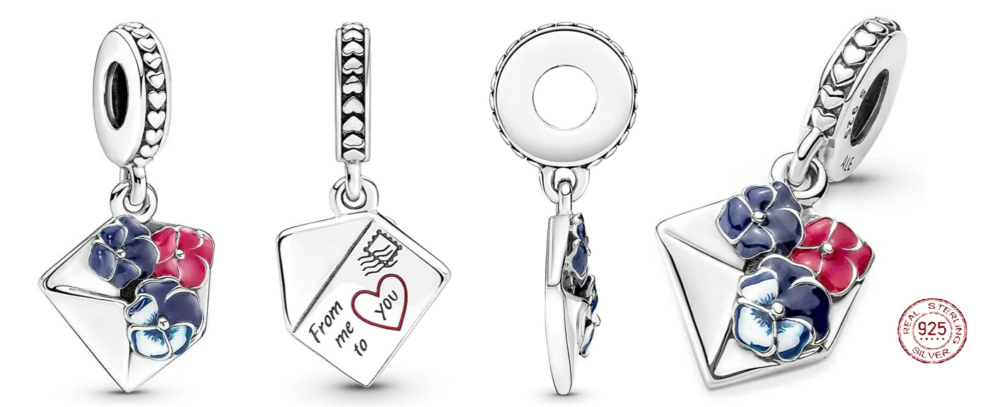 Charm Srebrna 925 Kwiatowa koperta, zawieszka na bransoletkę miłość