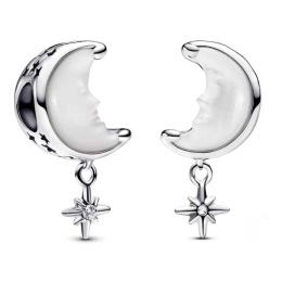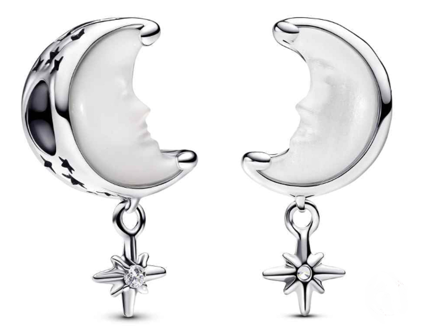 Nechte se vést noční oblohou s kouzlem Měsíce a Polárky. Měsíc je vyrobený z umělé perleti z bioPryskyřice s poklidnými detaily obličeje s vyřezávanými hvězdami. Polárka visí pod Měsícem a jasně září s jediným briliantovým broušeným kamenem v jeho středu.