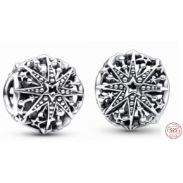Złap opadającą śnieżynkę i noś ją na swoich bransoletkach. Szczegółowo dopracowany zawieszek ze srebra zdobi po obu stronach wzór pięcioramiennej gwiazdy wewnątrz większej ośmioramiennej gwiazdy z dopracowanymi detalami i mikrokuliczkami tworzącymi efekt śnieżynki. Gwiazdę w środku otaczają małe fasetowane i wycinane gwiazdki tworzące magiczny, przyciągający wzrok wygląd dodający do Twojego świątecznego stylu niebiański odcień.