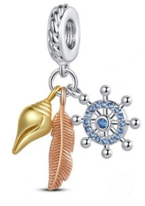 Steering wheel - przedstawia wskaźniki losu, ten, kto kieruje innych właściwym kierunkiem. Muszla - chroń to, co masz w sercu. Piórko - ochrona powietrznym żywiołem -symbol ochrony, wolności, jasności umysłu. Zawieszka wykonana z srebra 925 z pozłacaną muszlą i piórem Kraba, zaprojektowana z niebieskimi błyszczącymi cyrkoniami.